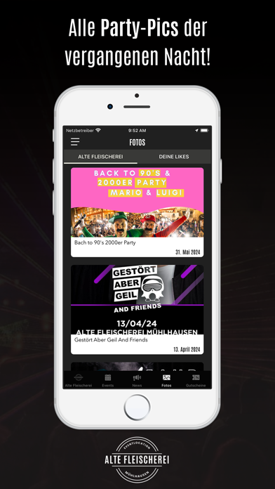Du erfährst als erster, wann die nächste Party steigt und profitierst dabei noch von fetten Aktionen. Zum Event sparst du mit unseren Gutscheinen bares Geld. Damit du dich am Tag danach auch an den geilen Abend erinnern kannst, stellen wir alle Party-Pics in der App bereit.